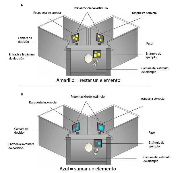 Si los elementos eran azules, es decir, suma, las abejas debían elegir el camino en el que el estímulo tenía un elemento más que la muestra. Si fueran amarillos, o resta, las abejas tenían que elegir el camino del estímulo que contenía un elemento menos.